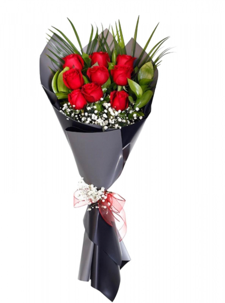 Siyah kağıt ile süslenmiş vip 9 adet kırmızı gülden oluşan şık ve sade güzel bir buket.