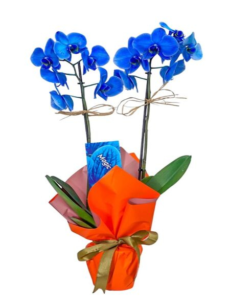 Çift dal mavi orkide turuncu süsleme ile tasarlanmıştır.