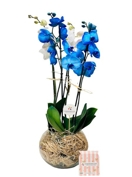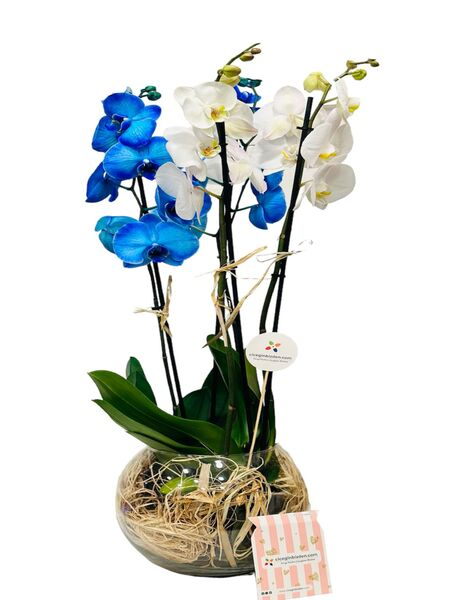 Fanusta Mavi Beyaz Orkideler