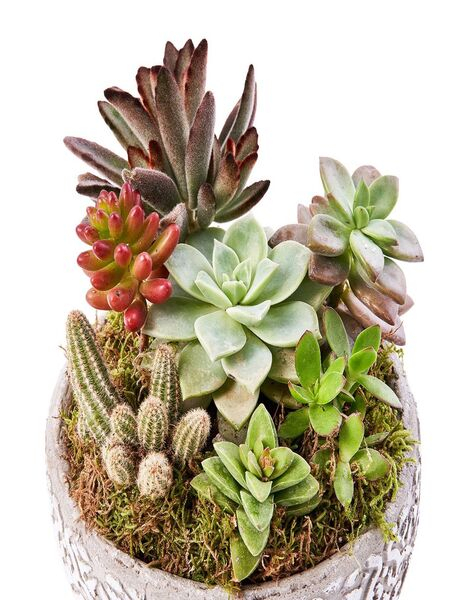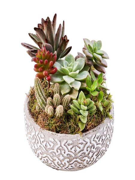 Gri eskitme saksı içerisine tasarlanmış, 8 adet sukulentten oluşan bir teraryumdur.