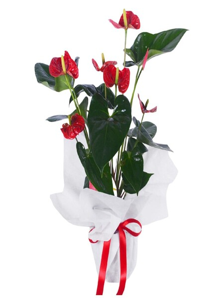 Antoryum çiçeği beyaz elyaf ile süslenmiştir.