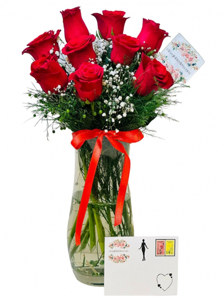 Paşabahçe vazo içerisine tasarlanmış yeşillik ve cipsolardan oluşan 9 adet kırmızı gül buketi.